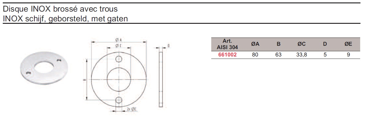 | 661002 | Rondelle inox 304 (br) Ø80/5 + Ø33.8 +2x Ø9 | 5 | 6.16 |