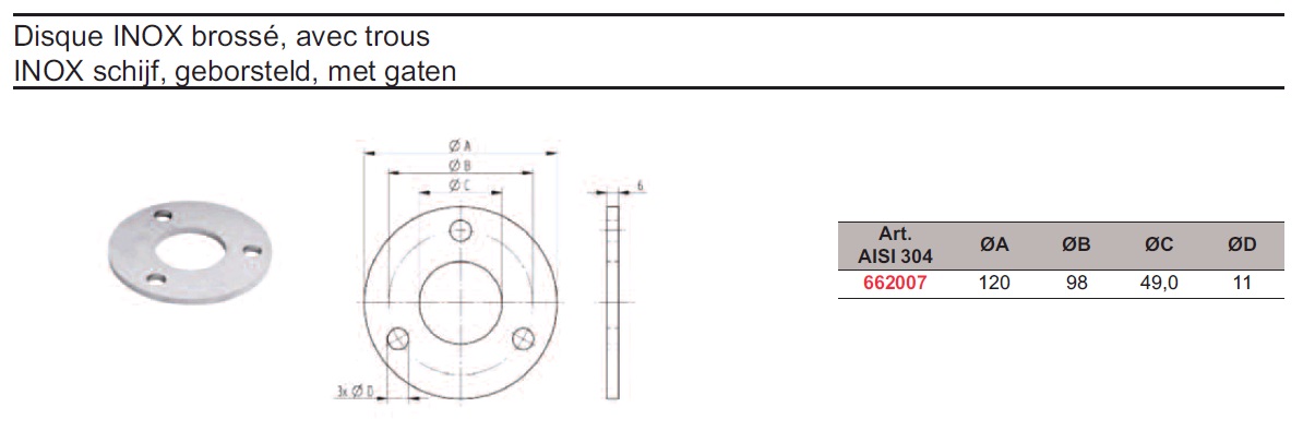 | 662007 | Rondelle inox 304 (br) Ø120/6 + Ø49 +3x Ø11 | 2 | 14.70 |