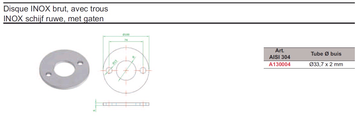 | A130001 | Rondelle inox 304 br Ø100 /Ø33,7 + 2tr | 3 | 16.88 |