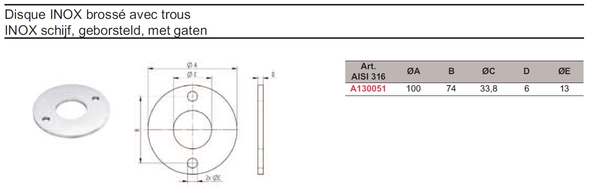 | A130051 | Rondelle inox 316 br Ø100 /Ø33,7 + 2tr | 0 | 21.38 |