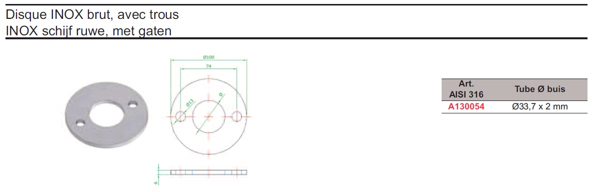 | A130054 | Rondelle inox 316 br Ø100 /Ø33,7 + 2tr | 0 | 22.78 |